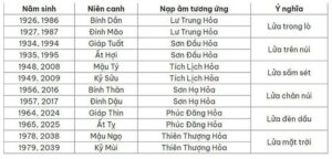Người mệnh Hỏa sinh vào các năm: 1934, 1994 (Giáp Tuất); 1935, 1995 (Ất Hợi); 1948, 2008 (Mậu Tý); 1949, 2009 (Kỷ Sửu); 1956, 2016 (Bính Thân); 1957, 2017 (Đinh Dậu); 1964, 2024 (Giáp Thìn); 1965, 2025 (Ất Tỵ); 1978, 2038 (Mậu Ngọ); 1979, 2039 (Kỷ Mùi); 1986, 1926 (Bính Dần); 1987, 1927 (Đinh Mão)